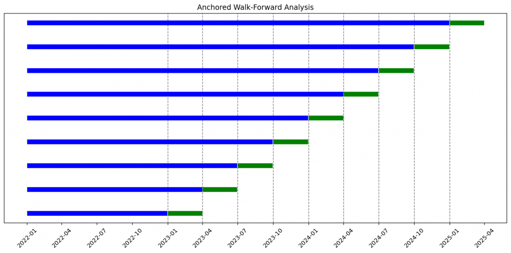 - Anchored Walk-Forward: The training period starts on the same date and expands over time.