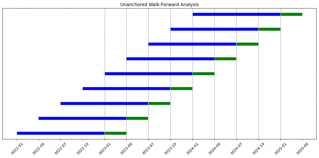 - Unanchored Walk-Forward: Both training and testing periods “slide” forward, keeping a fixed window length.