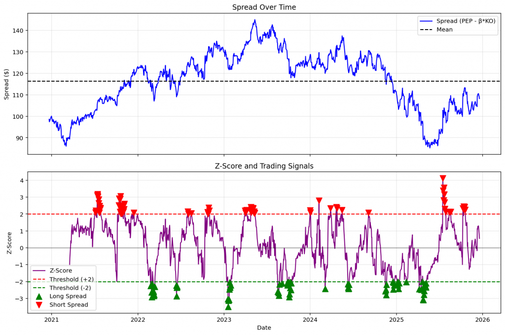 In this post, we’ll use Python to construct a spread between PEP and KO, calculate its z-score to identify when the spread deviates significantly from its mean, and generate trading signals based on statistical thresholds. This approach treats the spread as a stationary time series — a key assumption that we must consider and eventually test before deploying the strategy.