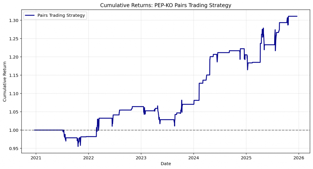 If, for example, both PEP and KO rise or fall with the broader market, their relationship often remains stable. When this relationship breaks temporarily — perhaps due to company-specific news or short-term sentiment — it creates a trading opportunity.