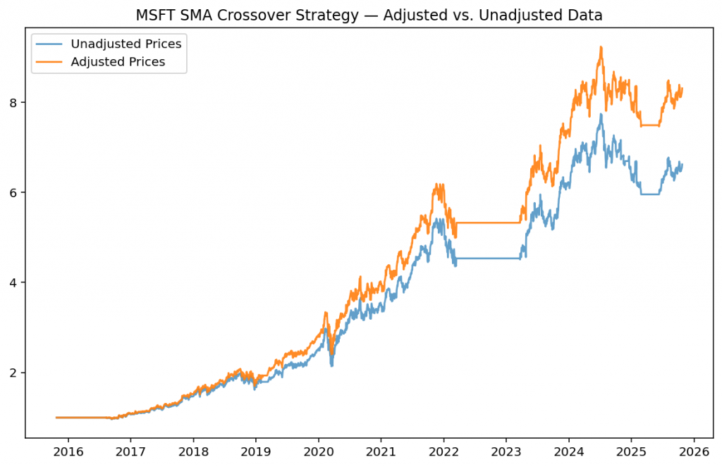 If you use unadjusted prices in a strategy that measures long-term performance, you’re not comparing apples to apples — you’re ignoring part of the fruit. 🍏