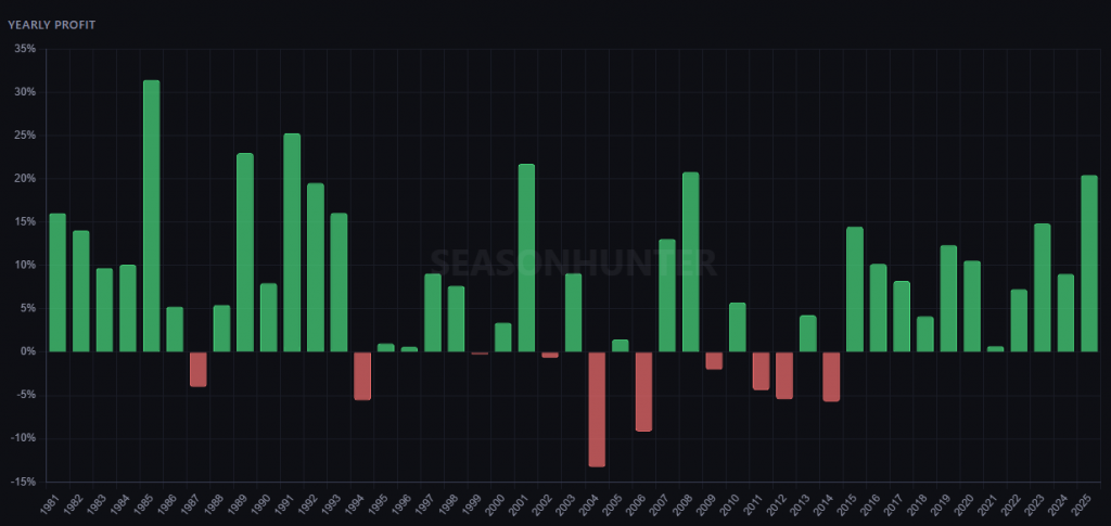 That’s not a small sample. 45 historical occurrences are enough to be statistically meaningful. Three out of every four times this trade was opened, it closed profitably. The one losing year in four is the noise you accept in exchange for the edge.